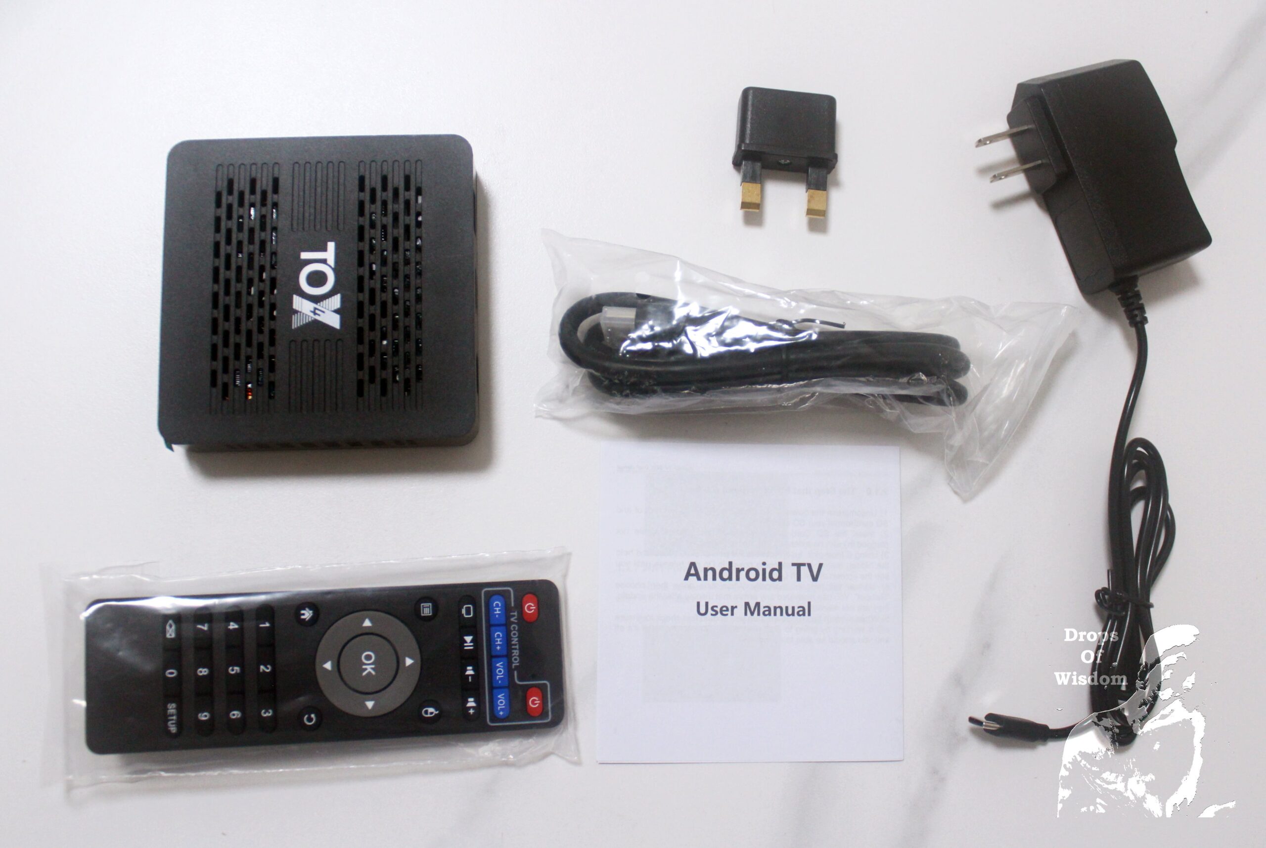 Here are the items that come in the box: TOX4 TV Box, 1 * IR Remote, 1 * HDMI Cable, 1 * User Manual, 1 * User Guide, 1 * Power Adapter, 1 * Detachable Antenna: