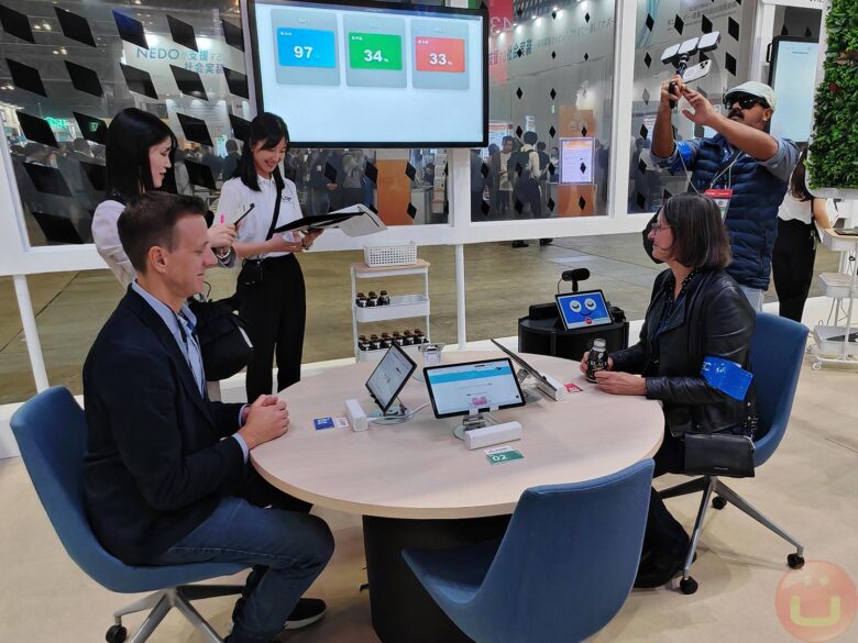 Rich DeMuro and Eliane Fiolet participating in Mitsubishi Electric’s Emoco Analytics Service demo at CEATEC 2025. Each monitor is paired with an Emoco Eye sensor that measures pulse and concentration without contact, the AI is displaying the real-time concentration level of each participant on the shared screen.