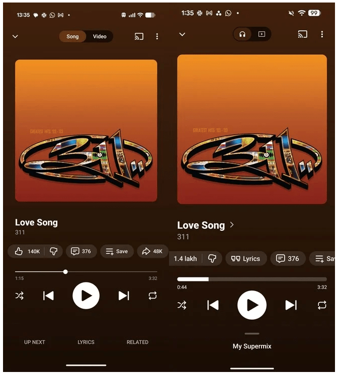 The lower section of the player has undergone a significant structural reorganization. The dedicated tabs for “Lyrics” and “Related” content, which were traditionally anchored to the bottom of the screen, have been removed from their original positions. In their place, the “Up Next” queue now occupies the primary footer area.